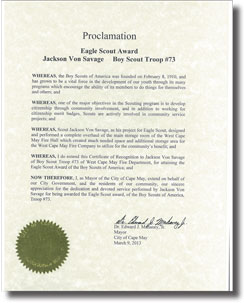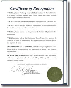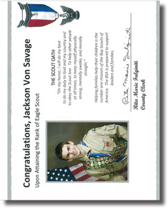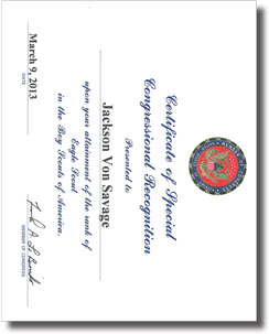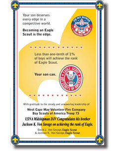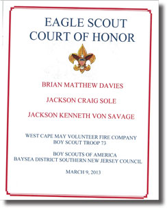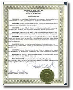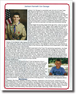 Without question, my proudest achievement to date is attaining the rank of Eagle Scout at the age of seventeen, earning forty-three merit badges along the way. As an active member of the Boys Scouts of America program since age four, I began in Cub Scout Pack 85 and eventually crossed over to West Cape Volunteer Fire Company Boy Scout Troop 73. Troop 73 was extremely fortunate to have exceptional Scout leaders and role models such as Lt. Col. Eugene Sole (Ret.) and my father, David I. Von Savage, who inspired Troop 73 scouts to become leaders in our community. A special mayoral citation to our troop in 2010 for "exceptional display of volunteerism" in manning emergency winter shelters is just one example over the years of Troop 73's spirit and hard work. All in all, I have participated in over fifty campouts, volunteered in over a hundred fundraising drives and community events, and assisted troop leaders and fellow scouts in countless meetings and activities by taking on all leadership positions. One of the highlights of my Scouting experience was a 2010 summer excursion to Philmont Scout Reservation, a two week wilderness training in the mountains of New Mexico, where I met and overcame the many physical and mental challenges that are presented in such a unique outdoor survival experience.